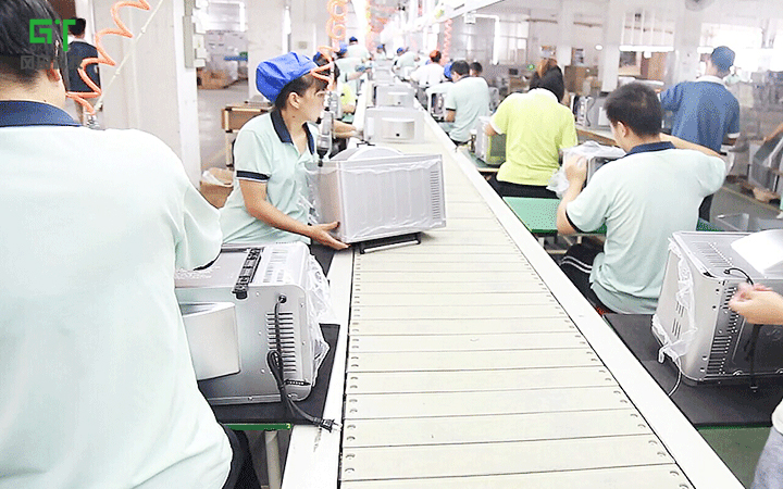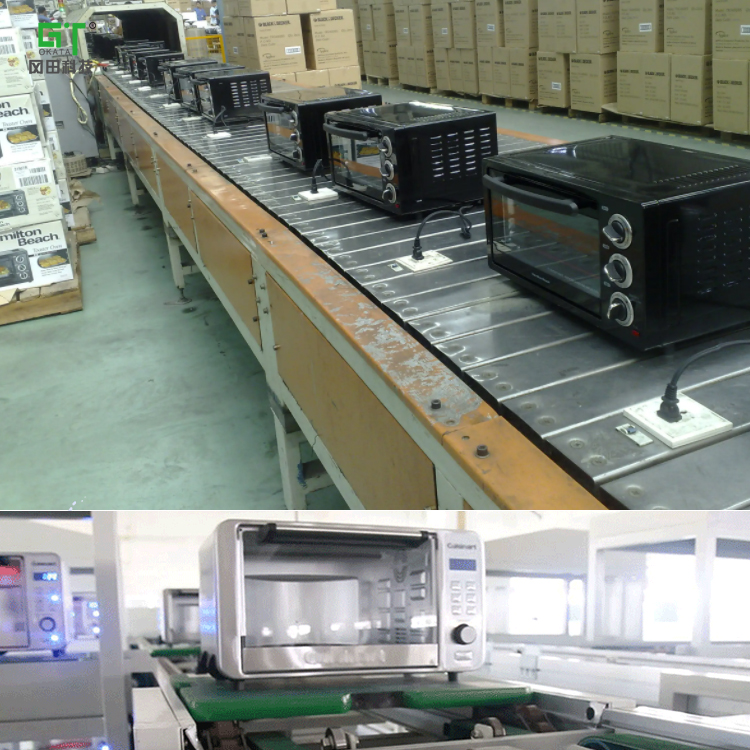 主要由鏈板輸送線組成,鏈板輸送機(jī)的輸送面平坦光滑,摩擦力小,可以游刃有余地輸送烤箱配件并進(jìn)行組裝。