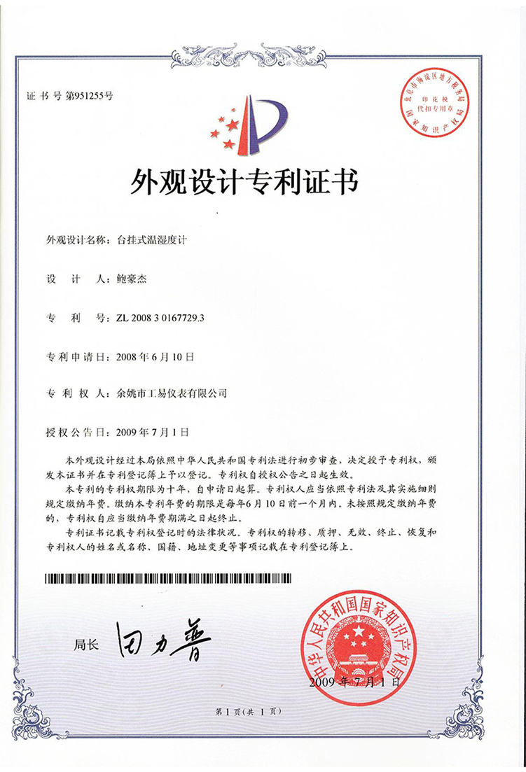 電子溫濕度計(jì)專利證書